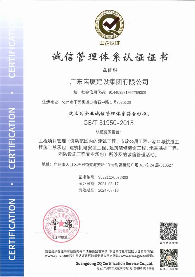 廣東諾廈建設集團有限公司是諾廈集團的核心企業,具備國家房屋建筑工程施工總承包壹級、市政工程施工總承包壹級、港口與航道工程總承包、建筑裝修裝飾工程、消防設施工程、地基基礎工程、機電設備安裝工程、體育場地設施工程、建筑智能化工程、河湖整治工程、水利水電工程等資質。......